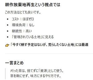 寒さを味方につけて、耕作放棄地の草刈りをしました。今回は「農地化を予定しない」ケースを想定し、AIを伴走者にプロンプトを設定しました。ポイントは刈った草を捨てない「草マルチ」と人手とコストを最小化する「年1回管理」です。最近、枯れ草の焼却による火災が増えていますが、燃やすのは危険なだけでなく、勿体ないことであり、草は「厄介者」でなく、土を守り、管理を楽にする資源になるということです。寒い今だからこそできる管理。人の知恵とAIを組み合わせれば、耕作放棄地は「負債」から「循環する風景」に変えられます。小さな実践の積み重ねが、地域全体の持続可能な土地管理につながると考えています。